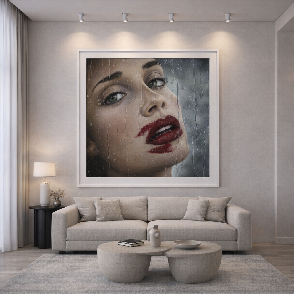 This hyperrealist figurative painting stands out for the expressive intensity of the portrait and the way it combines sensuality, drama, and sophistication within a composition of great visual impact. The female face, seen in close-up through a surface marked by water, acquires an almost cinematic dimension, where the gaze, the lips, and the red chromatic gesture create an image that is both bold and enigmatic. The technical precision in the depiction of skin, moisture, light, and transparencies reveals exceptional mastery of detail, reinforcing the work’s emotional and contemporary atmosphere. The result is a striking and immersive piece, ideal for spaces that value figurative art with personality, visual refinement, and a strong power of aesthetic seduction.– Gustavo Fernandes