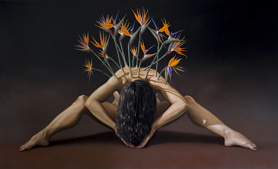 The woman folded into herself, intimate with her own being, a fertile territory where Nature bursts forth with both strength and delicacy, as if thought were breaking beyond the limits of the body.