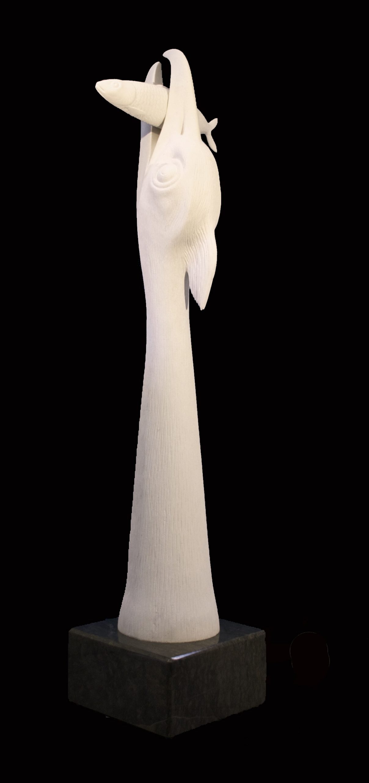 This sculpture stands out for its formal refinement and the serene elegance of its verticality, presenting a stylized figure that suggests lightness, elevation, and spirituality. The elongated lines and minimalist treatment of form give the piece a presence that is both delicate and noble, while the light tone enhances a sense of purity, silence, and timelessness. The composition reveals a remarkable balance between abstraction and figurative reference, allowing for an open, sensitive, and contemplative reading. The result is a sophisticated and distinctive work, ideal for spaces that value contemporary sculpture with aesthetic restraint, visual harmony, and a strong ability to convey serenity.– Gustavo Fernandes