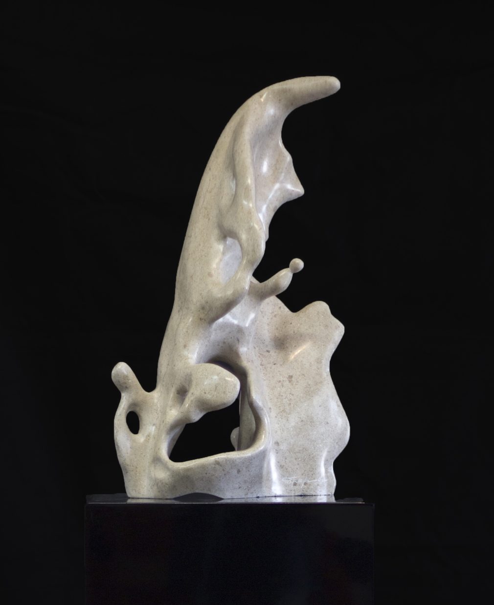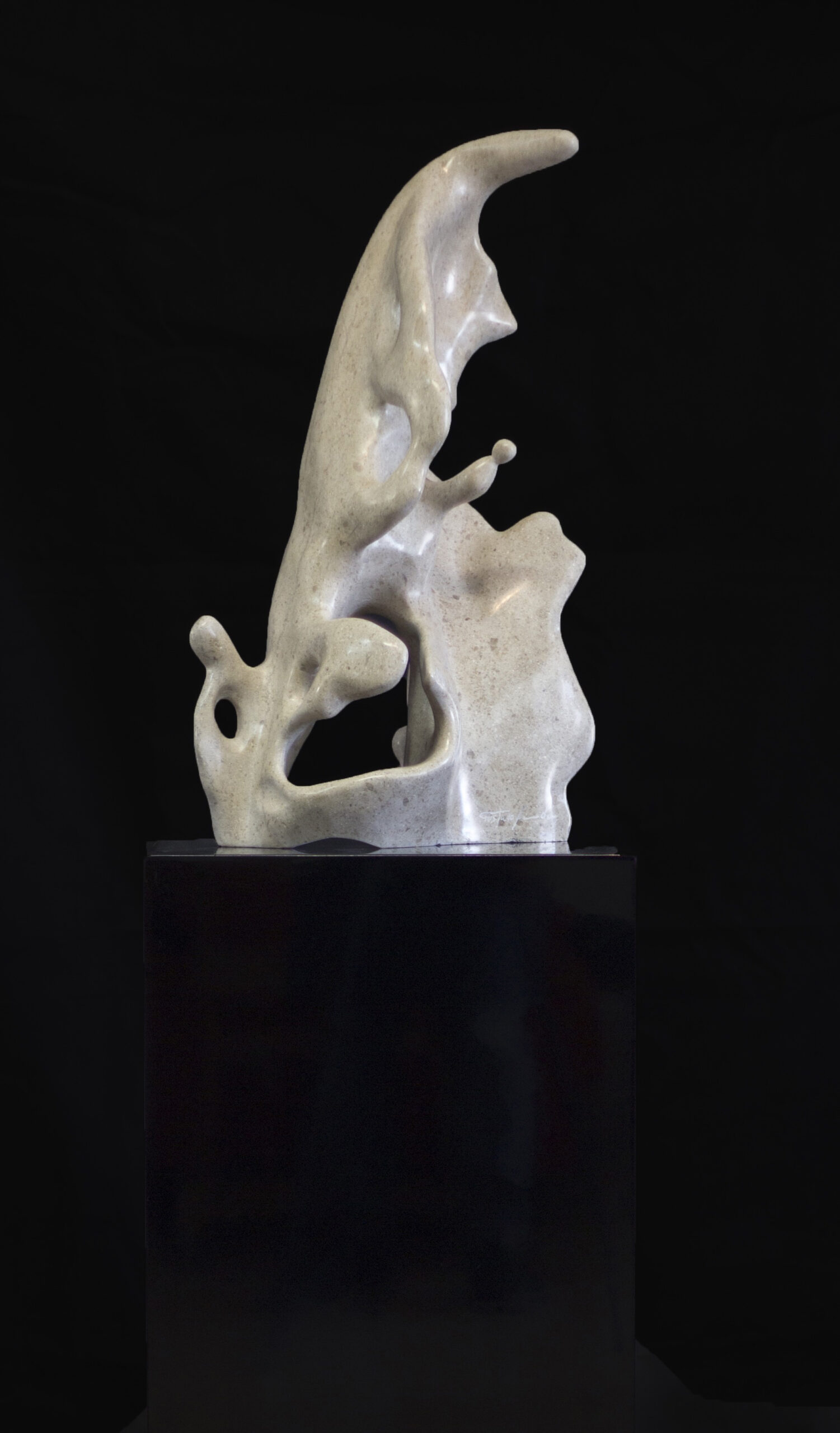 This sculpture stands out for the organic fluidity of its forms, suggesting movement, growth, and transformation through a refined and elegant visual language. The composition, marked by open volumes and ascending curves, creates a sense of lightness and continuous metamorphosis, allowing light to interact with the material and enhance the delicacy of the piece. The light tone reinforces the formal purity of the work and accentuates its contemporary character, while the dark base introduces contrast and stability, highlighting its sculptural presence. The result is a sophisticated and contemplative work, ideal for spaces that value abstract sculpture with harmony, subtlety, and a strong capacity to enrich the environment with serenity and distinction.– Gustavo Fernandes