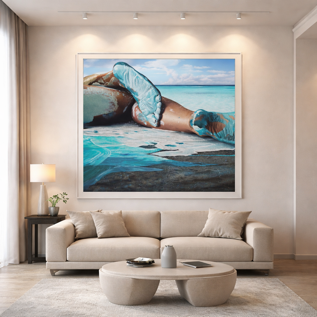 This hyperrealist figurative painting stands out for the way it merges body, sea, and imagination in a composition of great visual freshness and strong evocative power. The reclining figure by the water, partially transformed by forms that suggest foam, scales, or marine matter, creates an image that is both sensual and dreamlike, where the boundary between skin and ocean becomes subtle and poetic. The precise treatment of light, transparencies, reflections, and textures reveals remarkable technical mastery, while the luminous palette enhances an atmosphere of serenity, summer, and escape. The result is a contemporary, elegant, and distinctive work, ideal for spaces that value figurative art with a strong visual identity, conceptual delicacy, and a deep connection to the maritime world.– Gustavo Fernandes