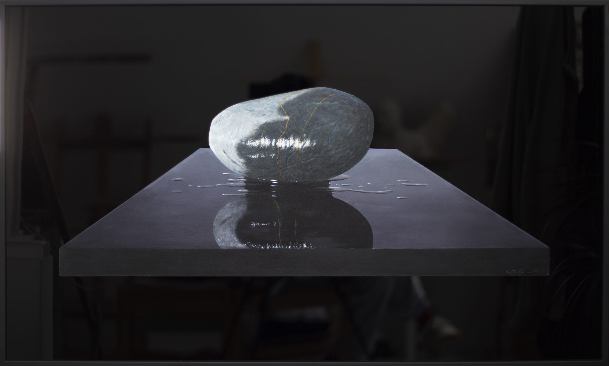 This figurative hyper-realistic painting stands out for the precision with which it captures matter, light, and the silence of the moment, transforming an apparently simple subject into a visual presence of great contemplative intensity. The stone, placed on a reflective surface, becomes the absolute focal point of the composition, while the subtle contrasts between shadow, sheen, and texture reveal a remarkable technical mastery and a highly refined sensitivity in constructing the atmosphere. The work invites a slow, measured reading, evoking serenity, balance, and introspection, while also asserting a clean and sophisticated aesthetic. It is a piece particularly suited to spaces that value formal restraint, contemporary elegance, and art capable of conveying depth through simplicity.– Gustavo Fernandes