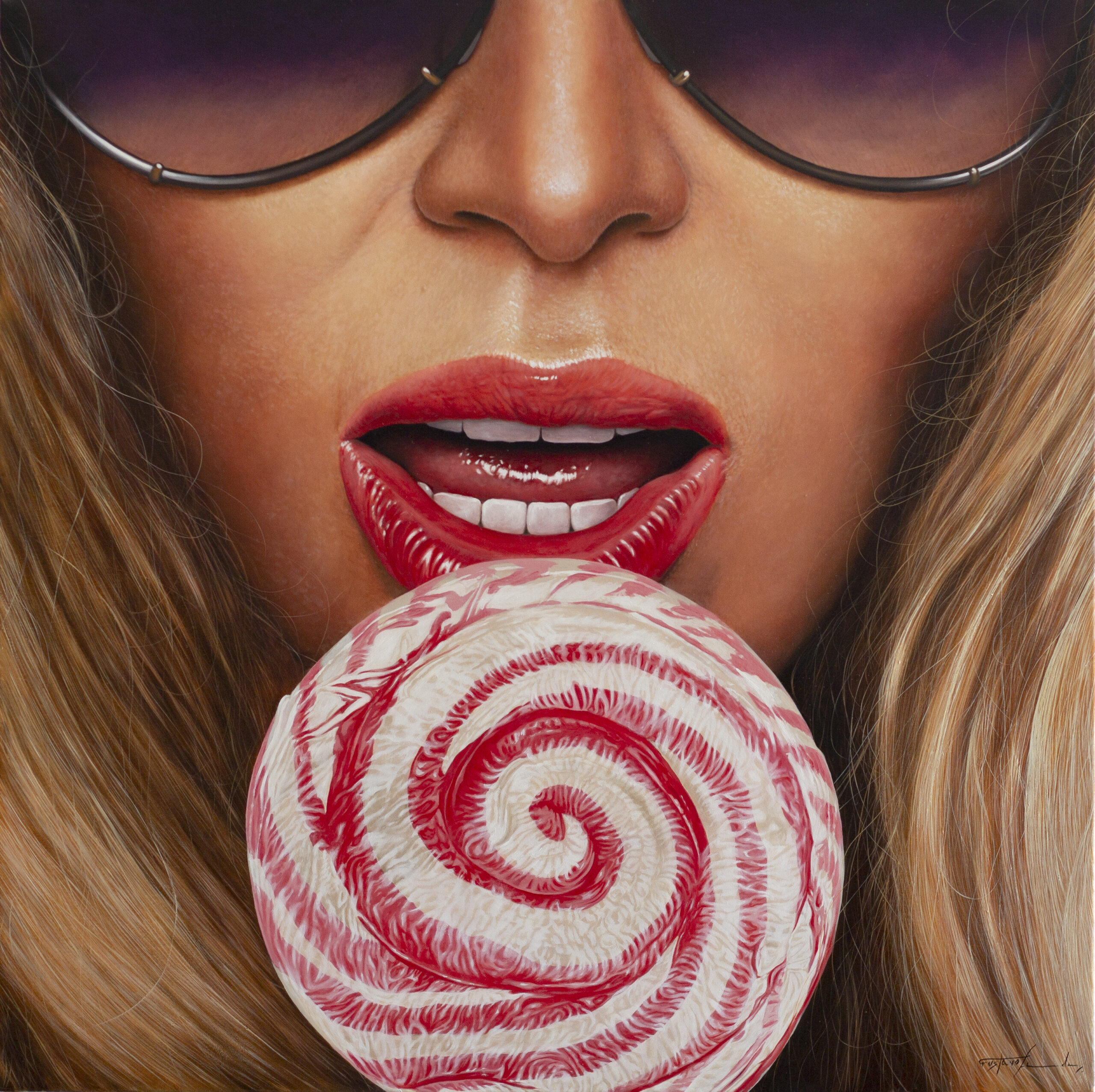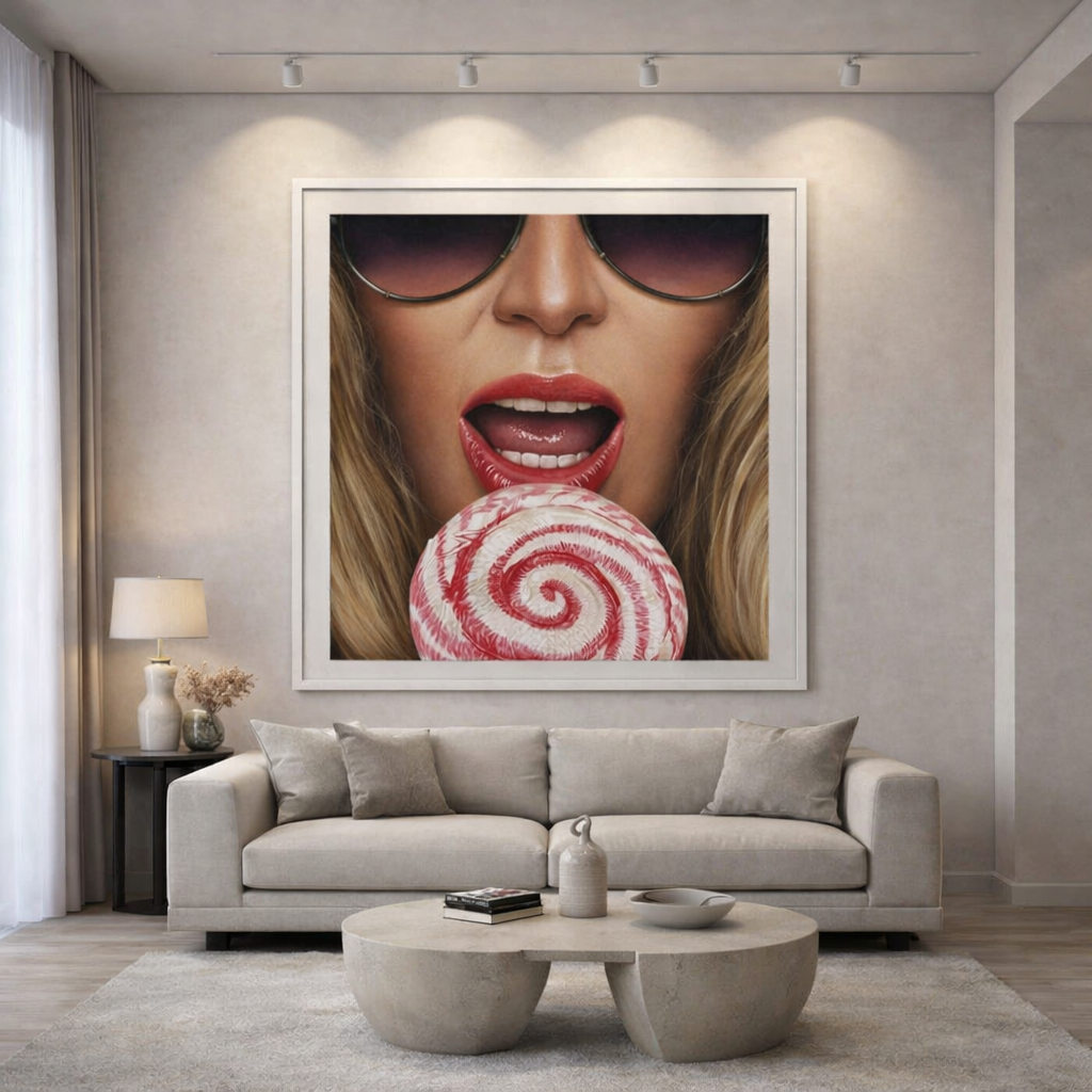 Esta pintura de hiper-realismo figurativo afirma-se pela sua linguagem visual sedutora e contemporânea, combinando glamour, cor e provocação numa composição de forte impacto estético. O enquadramento aproximado concentra a atenção nos lábios, no brilho dos óculos escuros e no rebuçado em espiral, criando uma imagem simultaneamente lúdica e intensa, onde o desejo é sugerido com sofisticação e irreverência. A precisão técnica na representação da pele, do cabelo, dos reflexos e das texturas evidencia um domínio excecional do detalhe, reforçando o carácter quase fotográfico da obra. O resultado é uma peça vibrante e marcante, ideal para espaços que valorizem arte figurativa com personalidade, sensualidade visual e uma presença decorativa assumidamente contemporânea.– Gustavo Fernandes