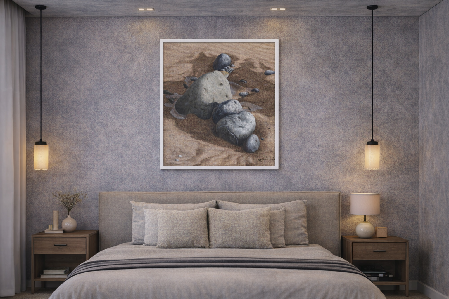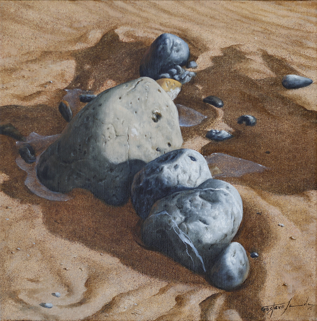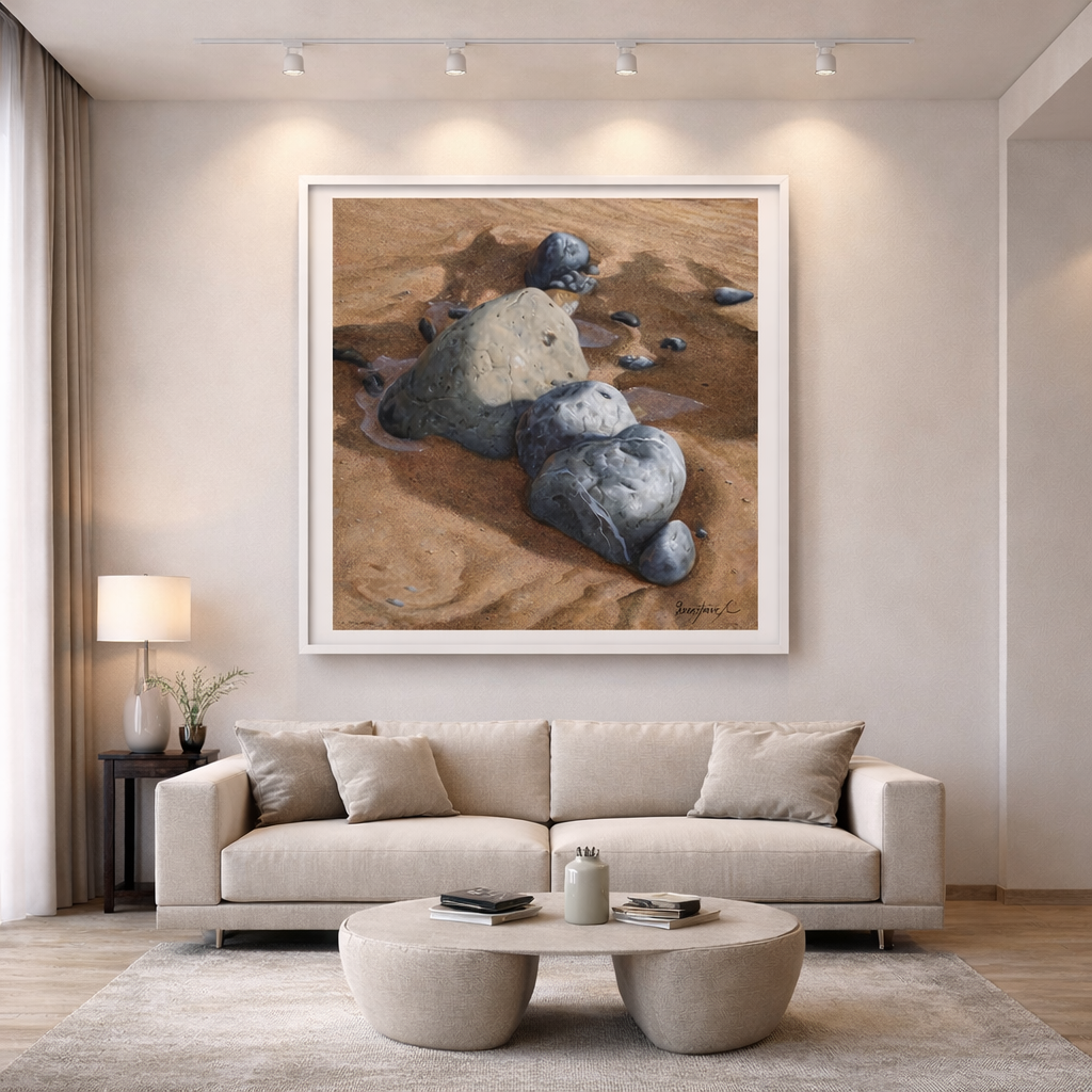 Esta pintura de hiper-realismo paisagístico revela uma notável capacidade de elevar um detalhe natural a uma composição de grande subtileza visual e força contemplativa. As pedras, parcialmente envolvidas pela areia húmida e por delicados veios de água, surgem representadas com um rigor técnico impressionante, evidenciando textura, volume e variações cromáticas com grande naturalismo. A proximidade do enquadramento reforça a intimidade da cena e convida a um olhar atento sobre a beleza silenciosa dos pequenos elementos da paisagem. O resultado é uma obra serena e sofisticada, ideal para espaços que valorizem realismo, sensibilidade estética e a capacidade da arte de revelar profundidade na aparente simplicidade da natureza.– Gustavo Fernandes
