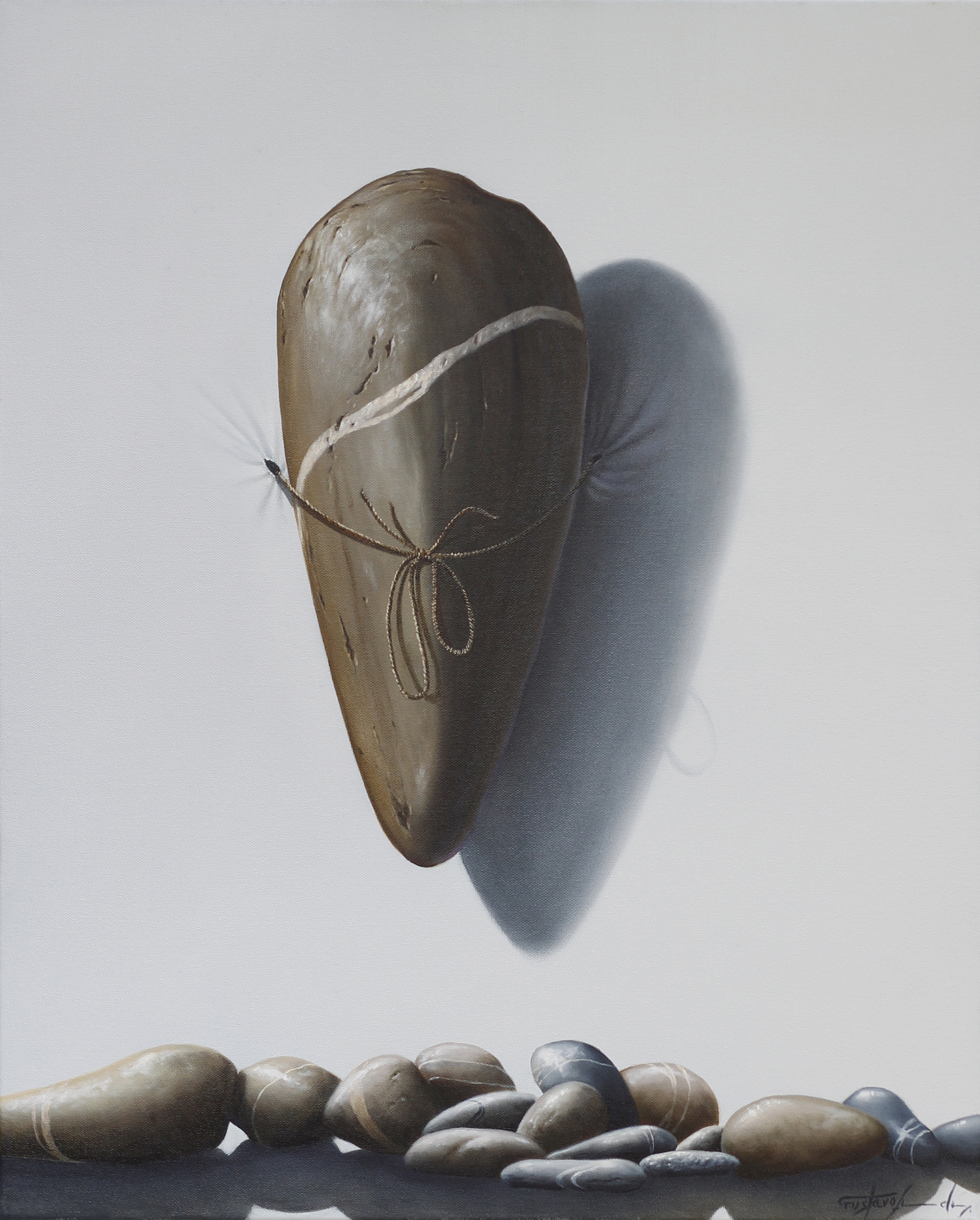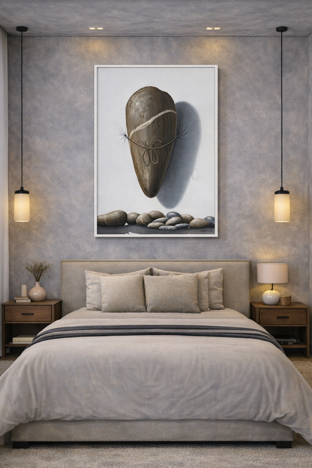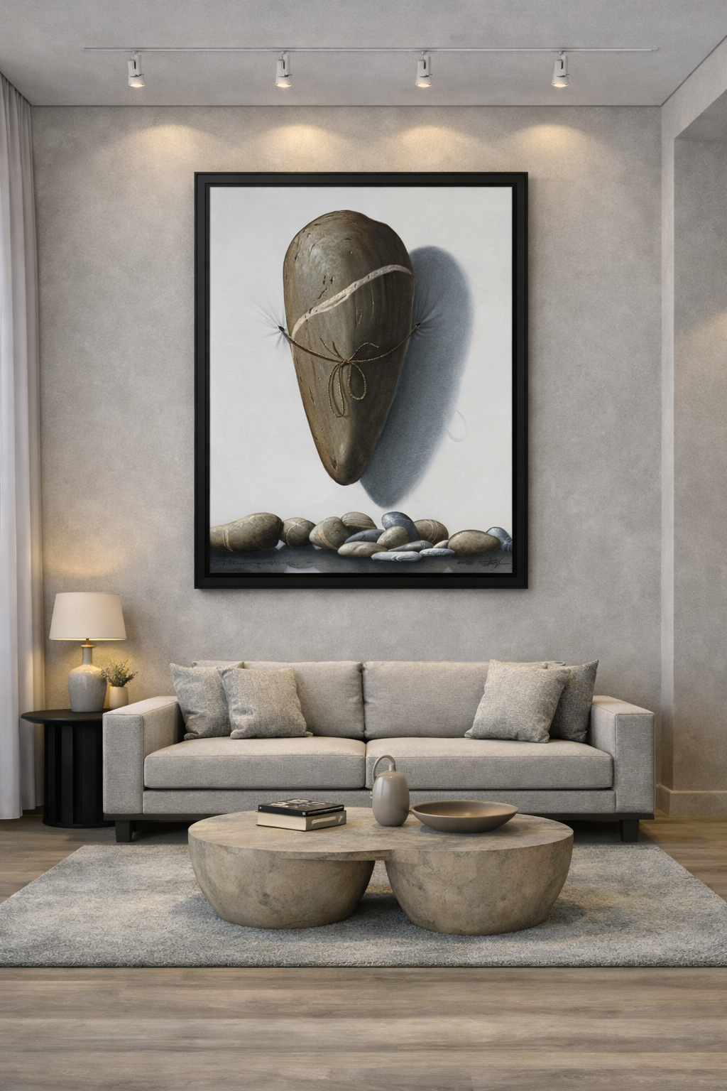 Esta pintura de hiper-realismo paisagístico destaca-se pela forma como converte um elemento natural simples numa imagem de forte tensão poética e visual. A pedra suspensa, envolvida por um fio delicado, desafia a lógica do peso e do equilíbrio, criando uma sensação de contenção, fragilidade e silêncio que prende o olhar de imediato. O rigor técnico na representação das superfícies, da sombra projetada e das subtis variações tonais evidencia um domínio notável da luz e da matéria, enquanto a composição depurada reforça a dimensão contemplativa da obra. O resultado é uma peça sofisticada e conceptualmente sugestiva, ideal para espaços que valorizem arte contemporânea com elegância, contenção formal e capacidade de despertar interpretação.– Gustavo Fernandes