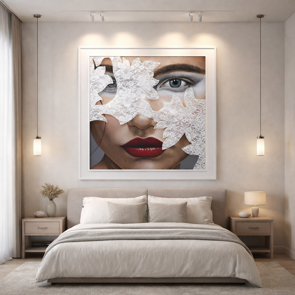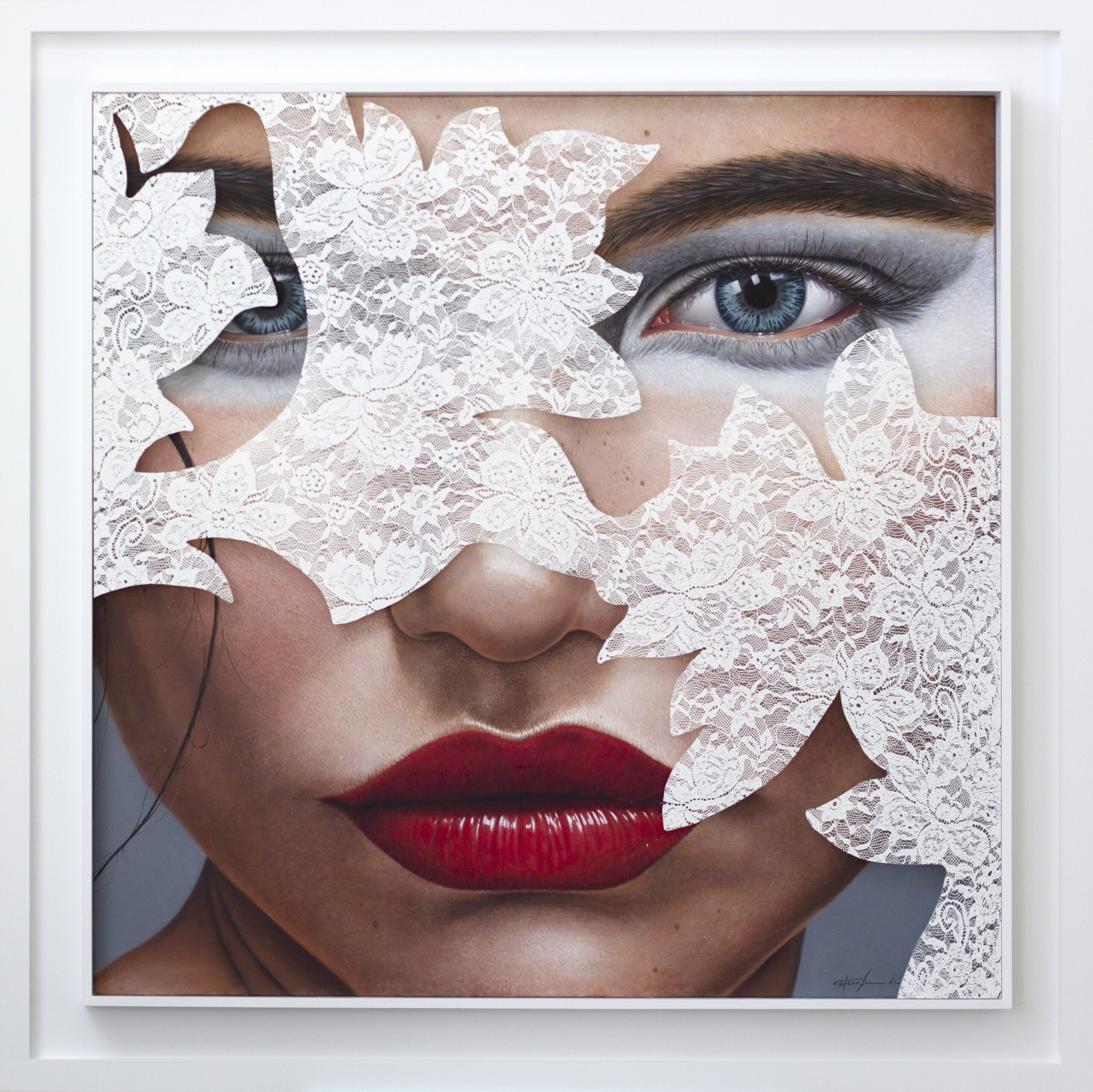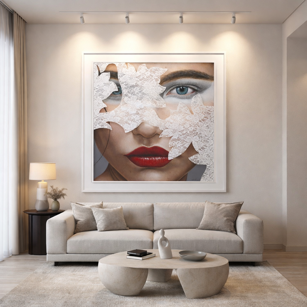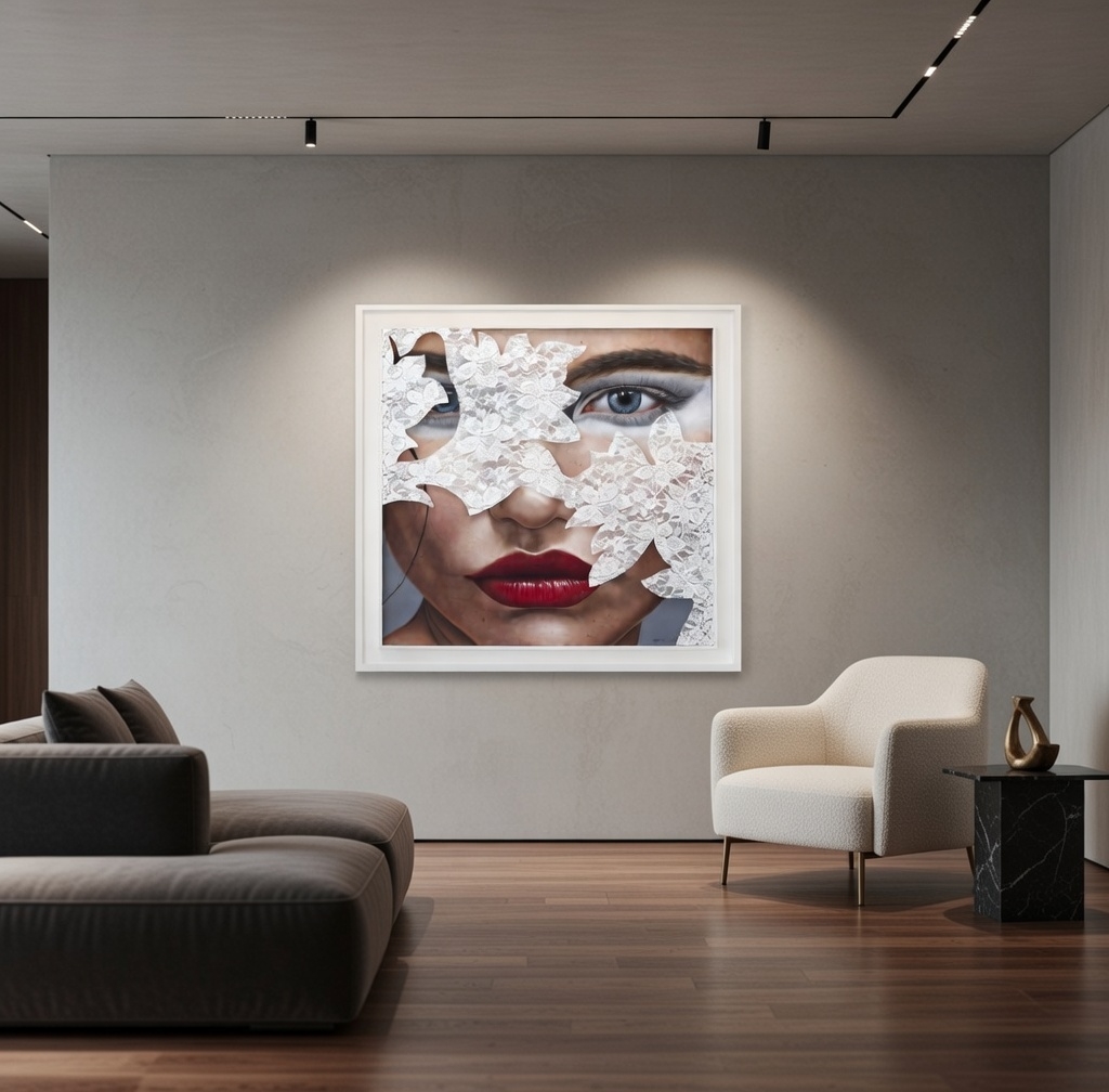 Esta pintura de hiper-realismo figurativo destaca-se pela forma como articula beleza, ocultação e identidade numa composição de forte impacto visual e refinamento contemporâneo. O rosto feminino, parcialmente velado por elementos rendilhados que evocam máscara, tecido ou ornamento, cria uma tensão subtil entre revelação e mistério, conduzindo o olhar para a intensidade dos olhos e para a expressividade dos lábios vermelhos. A precisão técnica no tratamento da pele, da maquilhagem, das transparências e das texturas evidencia um domínio excecional do detalhe, reforçando a sofisticação estética da obra. O resultado é uma peça elegante e marcante, ideal para espaços que valorizem arte figurativa com glamour, profundidade simbólica e grande capacidade de captar a atenção.– Gustavo Fernandes