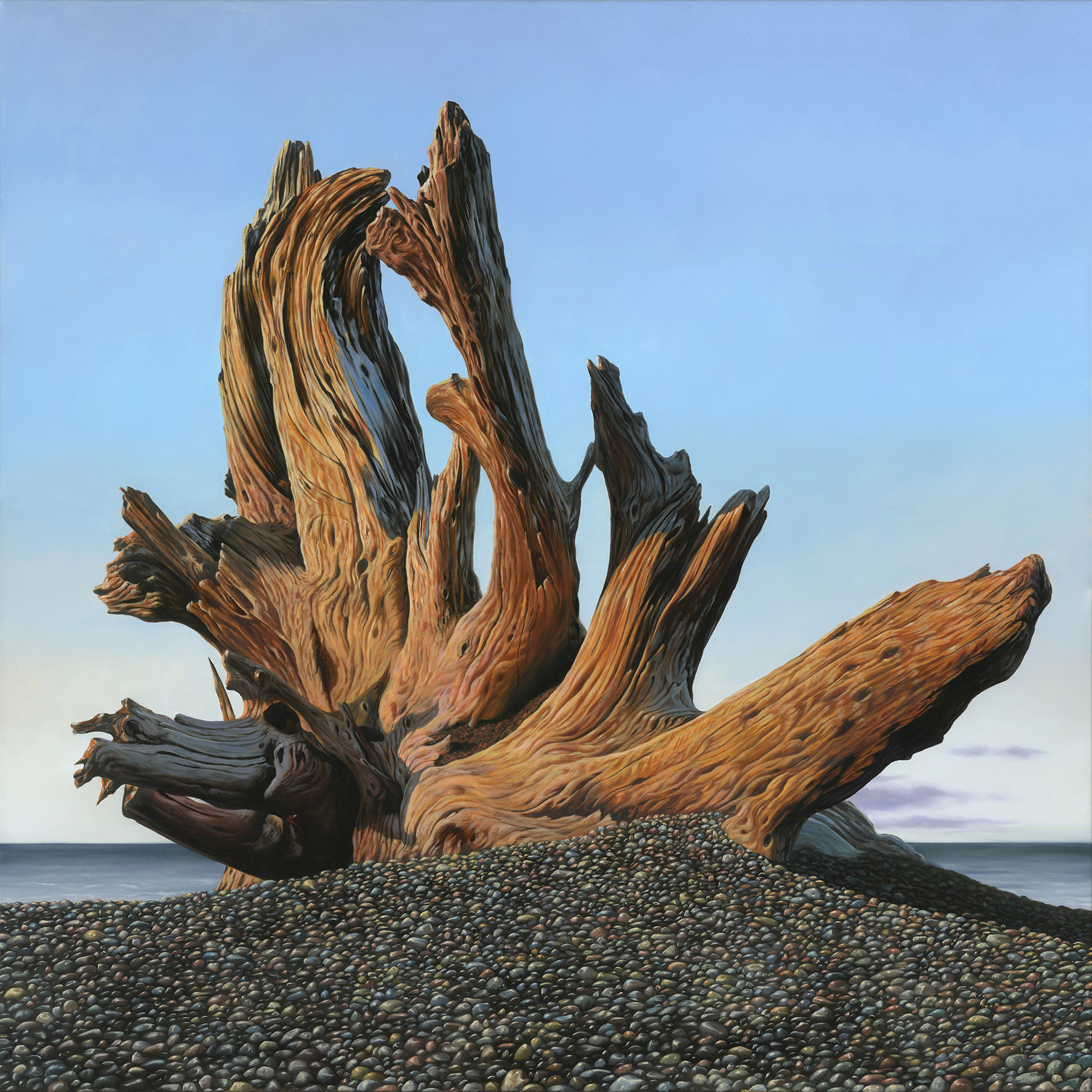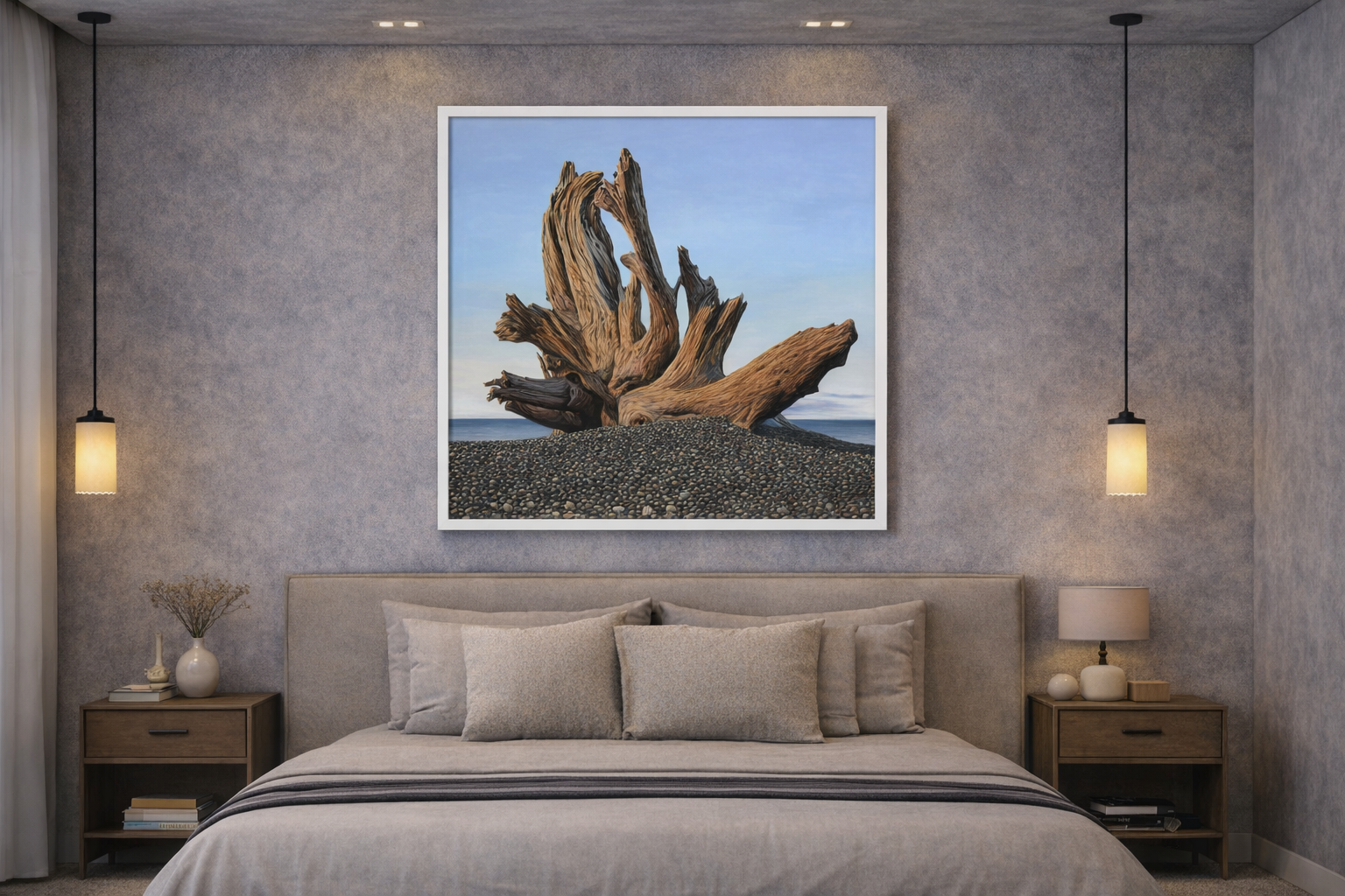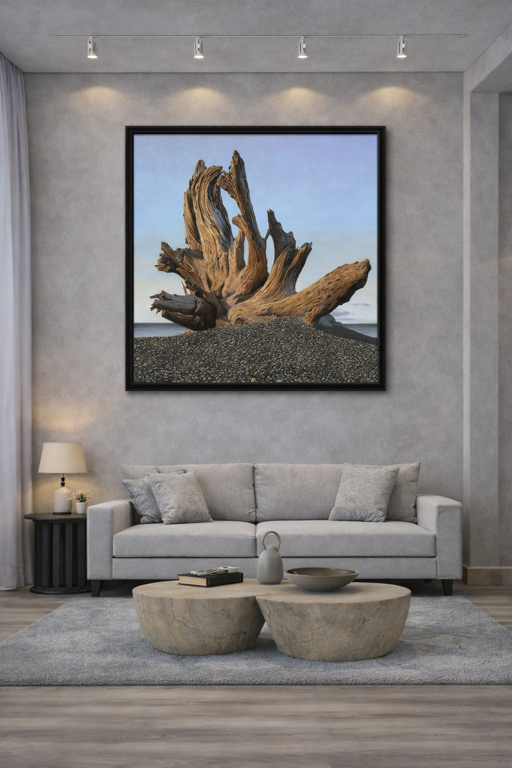 Esta pintura de hiper-realismo paisagístico impõe-se pela presença monumental da madeira esculpida pelo tempo, transformando um elemento natural num verdadeiro protagonista visual de grande força plástica. O tronco retorcido, pousado sobre a superfície pedregosa junto ao mar, revela um extraordinário trabalho de observação da textura, da luz e das variações cromáticas, evidenciando um domínio técnico muito apurado. A composição equilibra solidez e serenidade, sugerindo resistência, passagem do tempo e a beleza bruta da natureza em estado quase escultórico. O resultado é uma obra sofisticada e contemplativa, ideal para espaços que valorizem paisagens com carácter, profundidade visual e uma ligação subtil entre realismo, matéria e memória natural.– Gustavo Fernandes