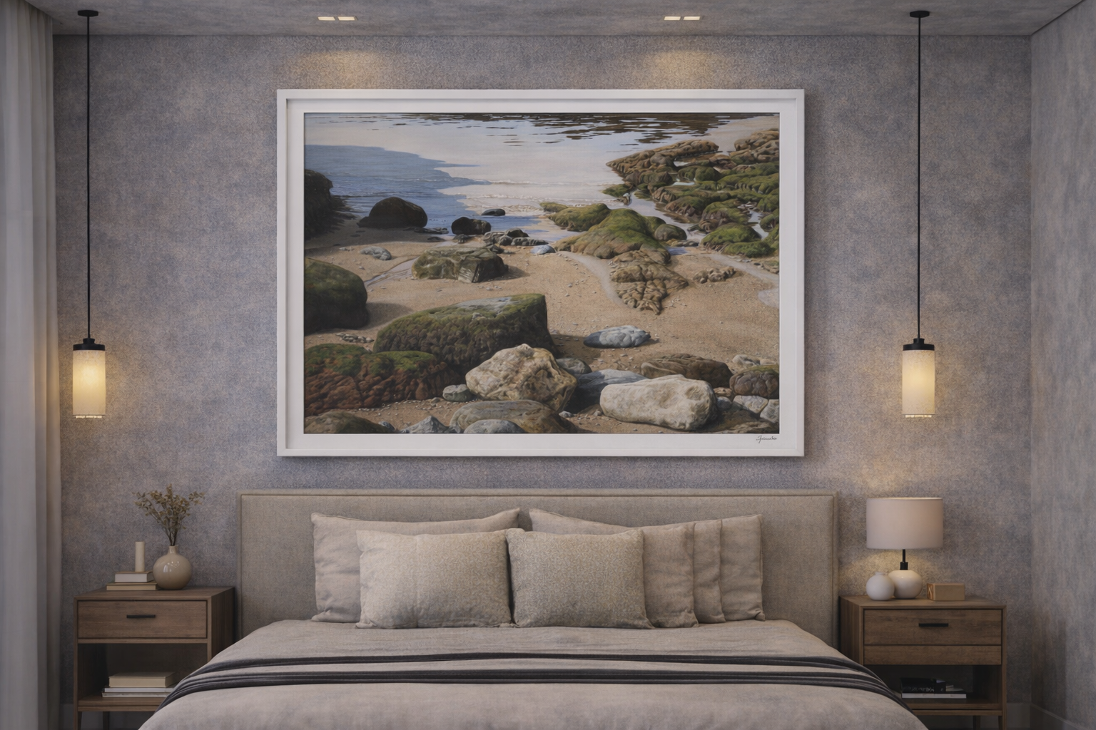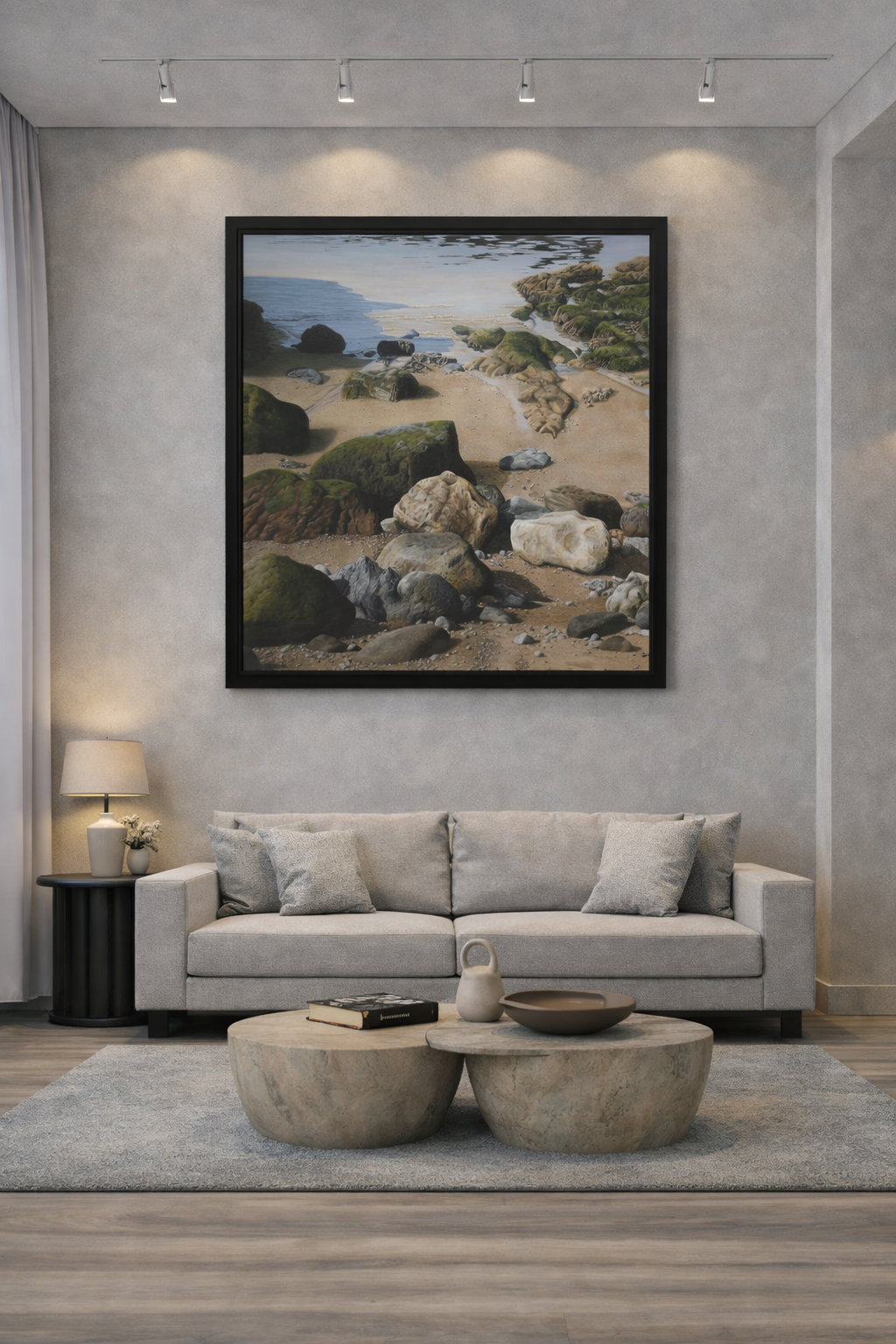 Esta pintura de hiper-realismo paisagístico distingue-se pela serenidade da sua composição e pela extraordinária precisão com que traduz a textura das pedras, da areia e da água em repouso. A cena, aparentemente simples, revela uma sensibilidade técnica notável na forma como capta a transparência das zonas húmidas, os reflexos subtis da superfície e as nuances cromáticas dos elementos naturais. O olhar é conduzido por um ritmo calmo entre volumes, margens e pequenos cursos de água, criando uma atmosfera de contemplação e equilíbrio. O resultado é uma obra elegante e intemporal, ideal para espaços que valorizem paisagens naturais com realismo, delicadeza visual e uma forte capacidade de transmitir tranquilidade.– Gustavo Fernandes
