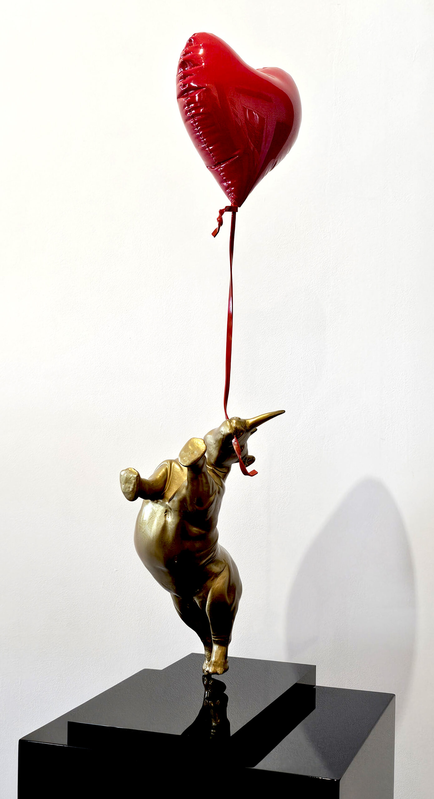 Esta escultura distingue-se pela forma como transforma a força compacta do rinoceronte numa imagem de inesperada ascensão, criando um contraste visual particularmente expressivo entre peso, impulso e leveza simbólica. A ligação ao balão vermelho introduz uma dimensão poética e quase lúdica, desafiando a lógica física e sugerindo liberdade, desejo de superação ou a capacidade de elevação perante a densidade do real. O acabamento metálico reforça a presença escultórica da peça, valorizando os volumes e os reflexos com elegância contemporânea, enquanto a verticalidade da composição intensifica o seu dinamismo visual. O resultado é uma obra marcante e sofisticada, ideal para espaços que valorizem arte com identidade, originalidade e forte poder de evocação.– Gustavo Fernandes