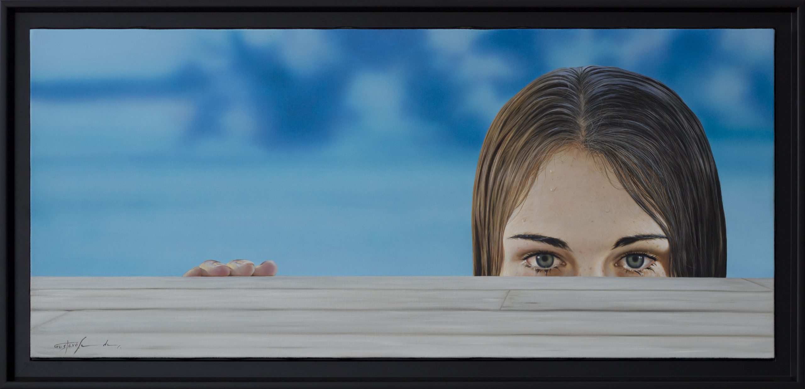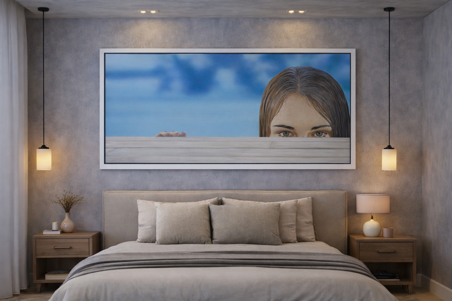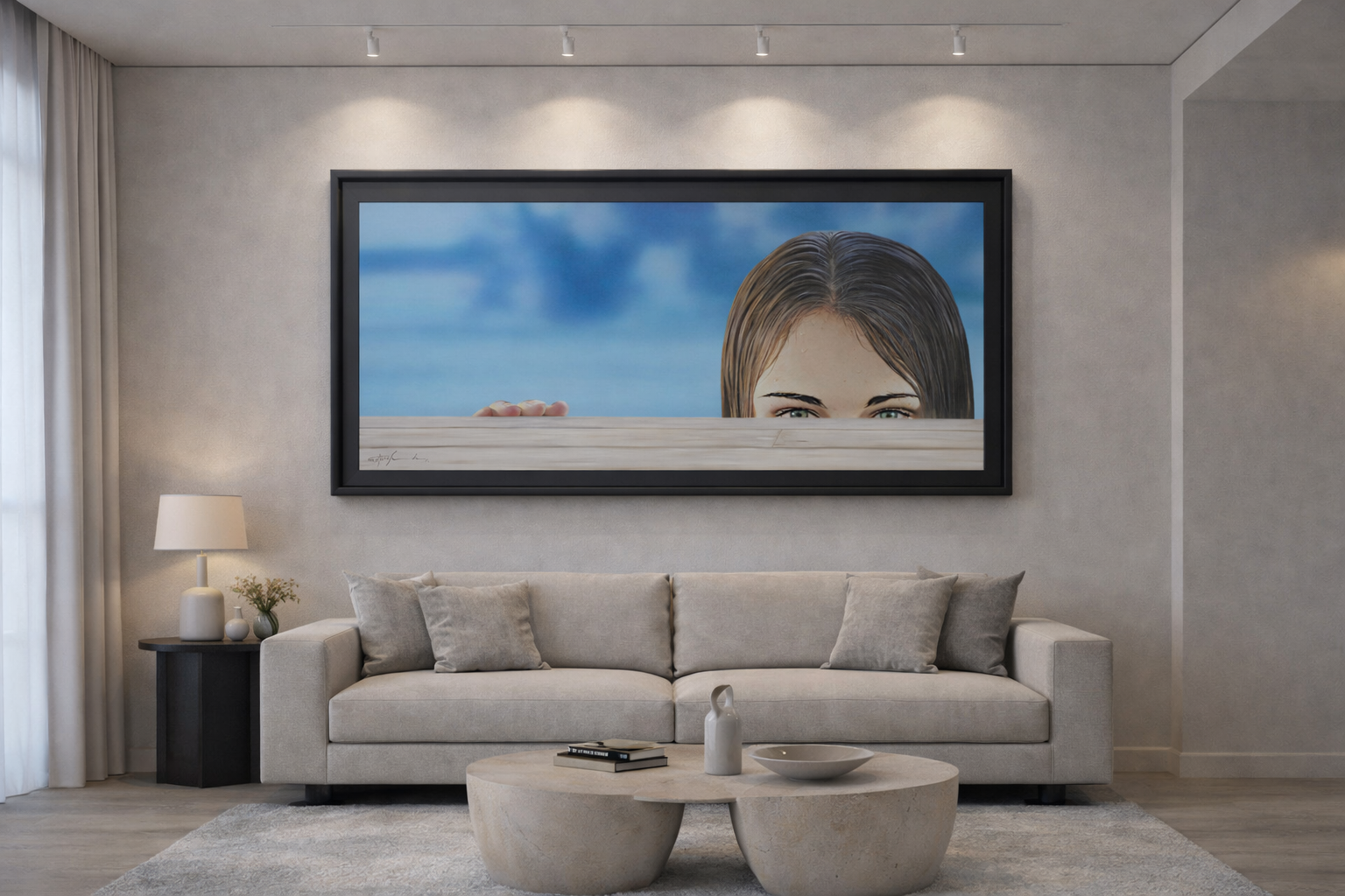 Esta pintura de hiper-realismo figurativo distingue-se pela força sugestiva da sua composição minimalista, onde o rosto surge apenas parcialmente revelado, intensificando a sensação de mistério, expectativa e presença silenciosa. O olhar, preciso e luminoso, torna-se o verdadeiro centro emocional da obra, estabelecendo uma ligação imediata com o observador e contrastando com a serenidade quase abstrata do fundo azul. A contenção dos elementos visuais reforça o impacto da imagem e evidencia um domínio técnico notável na representação da pele, do cabelo, da luz e das superfícies. O resultado é uma peça contemporânea, subtil e marcante, ideal para espaços que valorizem arte figurativa com elegância, introspeção e forte capacidade de captar a atenção através da simplicidade.– Gustavo Fernandes
