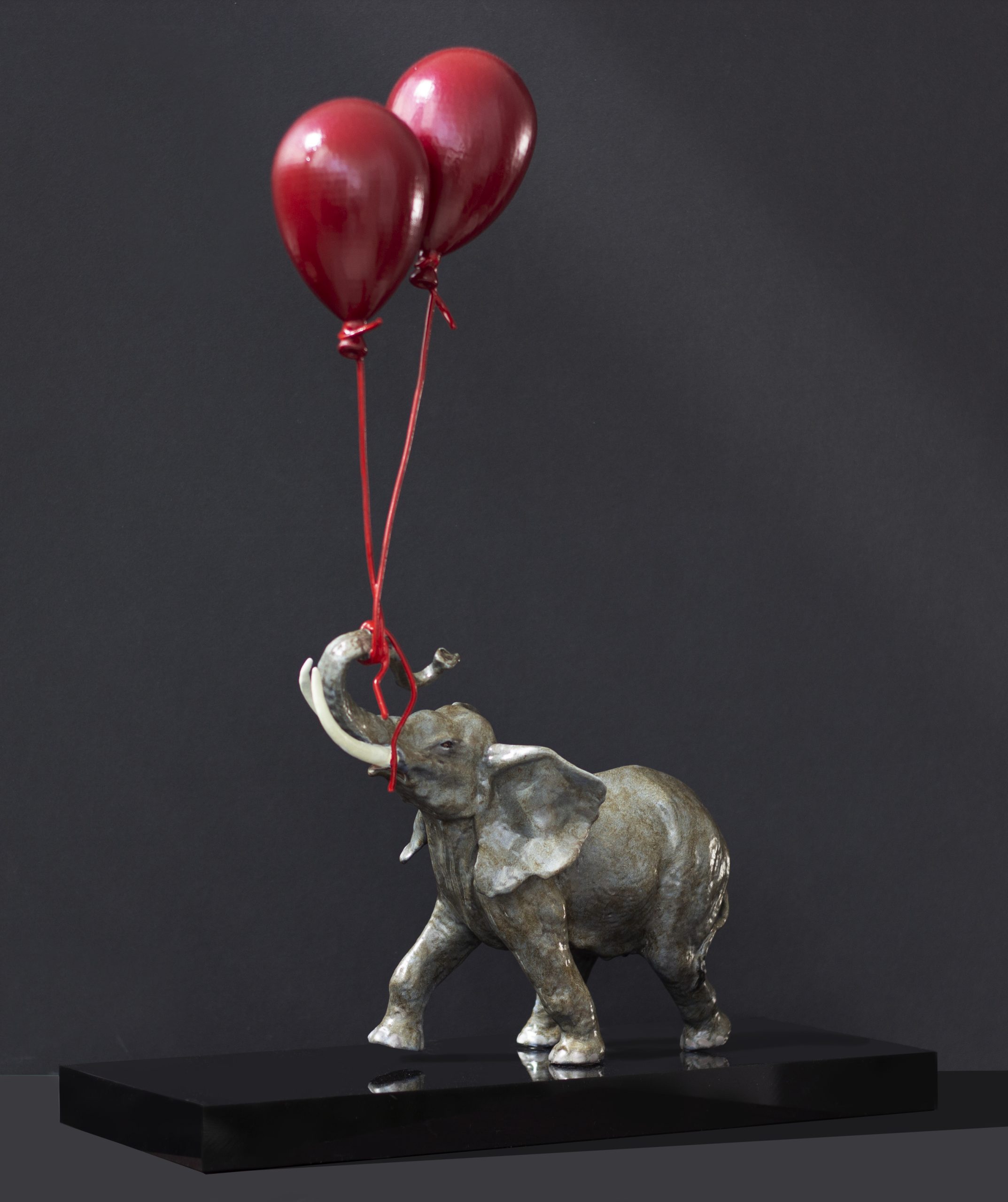Esta escultura conquista pela forma como conjuga imponência e leveza numa composição visualmente envolvente, onde a figura do elefante surge em contraste com a delicadeza simbólica dos dois balões vermelhos. A robustez natural do animal é reinterpretada com um tom quase lúdico e poético, criando uma sensação de movimento, elevação e inesperada ternura. O contraste cromático entre os tons metálicos da escultura e o vermelho intenso dos balões reforça o impacto visual da peça, tornando-a especialmente expressiva e memorável. Trata-se de uma obra contemporânea com forte presença decorativa, ideal para interiores que valorizem arte com personalidade, imaginação e capacidade de humanizar o espaço com sofisticação.– Gustavo Fernandes