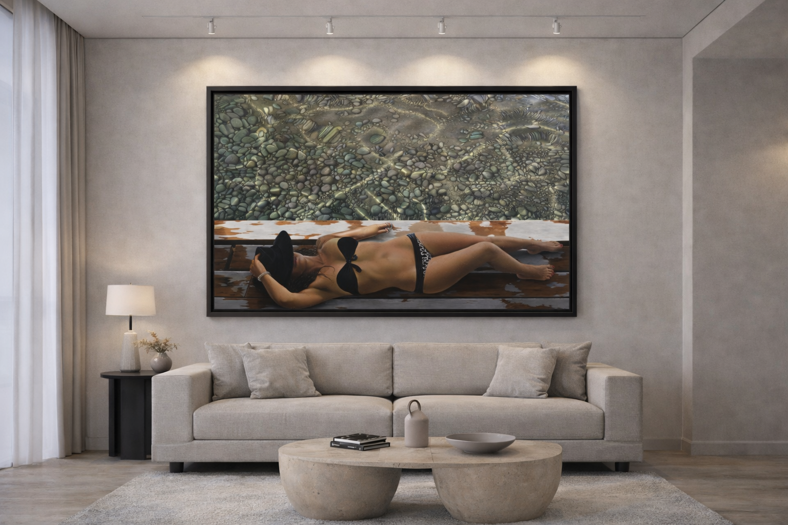 Esta pintura de hiper-realismo figurativo distingue-se pela forma como alia sensualidade, composição e observação rigorosa da luz numa cena de forte impacto visual e grande sofisticação técnica. A figura reclinada, integrada num enquadramento que articula corpo, sombra, madeira e transparência da água, cria uma relação subtil entre presença humana e paisagem envolvente, reforçando a atmosfera de calor, repouso e contemplação. O tratamento minucioso da anatomia, dos reflexos e das texturas evidencia um domínio excecional do realismo, enquanto a perspetiva superior acrescenta originalidade e profundidade à composição. O resultado é uma obra contemporânea, elegante e envolvente, ideal para espaços que valorizem arte figurativa com refinamento visual, serenidade e uma forte capacidade evocativa.– Gustavo Fernandes
